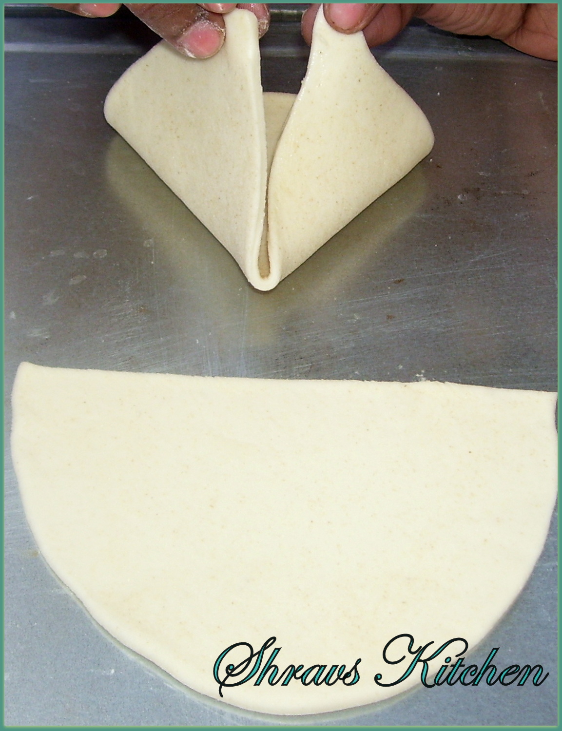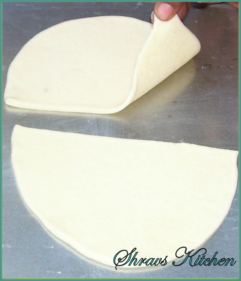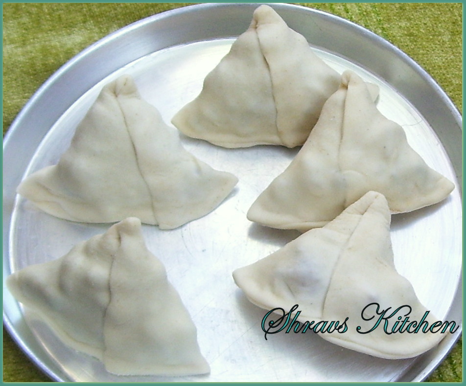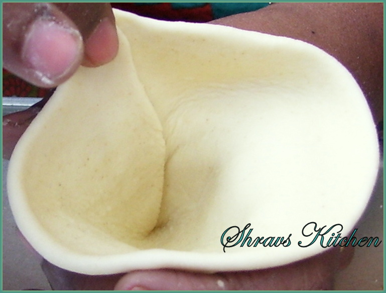 7. After joining them it will be in the shape of cone. Now stuff with the prepared curry, apply 2 drops of water to the corners 8. Take a kadai, add oil and allow to heat.