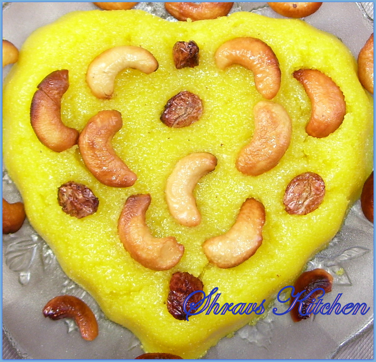 1. Take a pan, add 1 tsp of Ghee and allow to heat. Fry cashew nuts, raisins and keep aside. Add suji to the same pan,